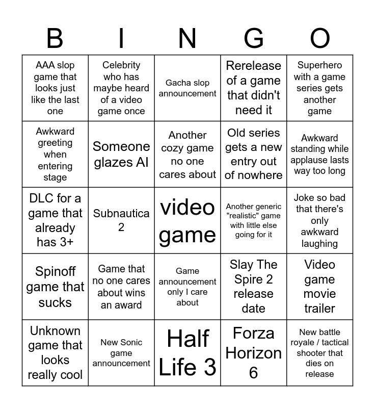 This bingo card has a free space and 24 words: Game that no one cares about wins an award, New Sonic game announcement, Another cozy game no one cares about, Unknown game that looks really cool, Superhero with a game series gets another game, AAA slop game that looks just like the last one, Awkward greeting when entering stage, Celebrity who has maybe heard of a video game once, Another generic "realistic" game with little else going for it, Game announcement only I care about, Old series gets a new entry out of nowhere, DLC for a game that already has 3+, Slay The Spire 2 release date, Video game movie trailer, Someone glazes AI, Forza Horizon 6, Joke so bad that there's only awkward laughing, Gacha slop announcement, Awkward standing while applause lasts way too long, Subnautica 2, New battle royale / tactical shooter that dies on release, Spinoff game that sucks, Rerelease of a game that didn't need it and Half Life 3.