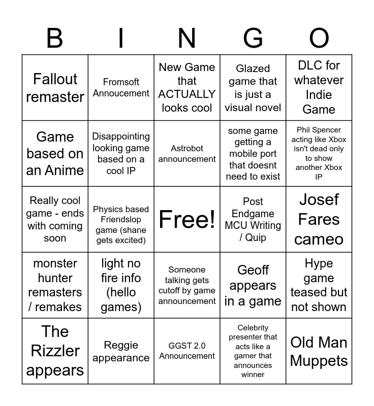 This bingo card has a free space and 40 words: Sid the Science Kid moment, Physics based Friendslop game (shane gets excited), show / movie adaptation of a game that seems like it wouldnt work, Post Endgame MCU Writing / Quip, Geoff talking about a good friend and it is Kojima, The Rizzler appears, Disappointing looking game based on a cool IP, elder scrolls 6 trailer, some game getting a mobile port that doesnt need to exist, Hype game teased but not shown, Really cool game - ends with coming soon, Fromsoft Annoucement, Celebrity presenter that acts like a gamer that announces winner, Josef Fares cameo, monster hunter remasters / remakes, light no fire info (hello games), Hype Teaser - is chinese / gacha game, Glazed game that is just a visual novel, Ends on another Sony CGI trailer, Fallout remaster, Reggie appearance, Astrobot announcement, Geoff appears in a game, Phil Spencer acting like Xbox isn't dead only to show another Xbox IP, Kojima, GTA 6 Announcement, GGST 2.0 Announcement, FF7 Part 3, KH4 Announcement, Gooner Game, No New 1st Party Nintendo Game, New Game that ACTUALLY looks cool, Weird Statue isnt Divinity related, Old Man Muppets, Game based on an Anime, 2XKO Character is a Goddess, Someone talking gets cutoff by game announcement, New Lego Game, DLC for whatever Indie Game and CyberPunk Anime Season 2.