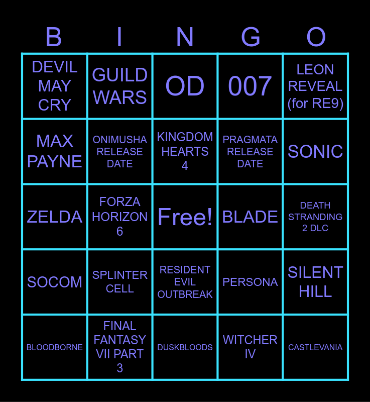 This bingo card has a free space and 24 words: SPLINTER CELL, FINAL FANTASY VII PART 3, KINGDOM HEARTS 4, BLOODBORNE, LEON REVEAL (for RE9), DEVIL MAY CRY, MAX PAYNE, GUILD WARS, BLADE, RESIDENT EVIL OUTBREAK, PRAGMATA RELEASE DATE, ZELDA, PERSONA, SILENT HILL, ONIMUSHA RELEASE DATE, WITCHER IV, DEATH STRANDING 2 DLC, OD, SONIC, FORZA HORIZON 6, CASTLEVANIA, SOCOM, 007 and DUSKBLOODS.