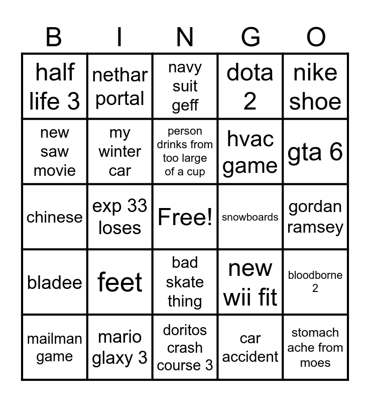 This bingo card has a free space and 24 words: feet, mario glaxy 3, person drinks from too large of a cup, mailman game, nike shoe, half life 3, new saw movie, nethar portal, snowboards, bad skate thing, hvac game, chinese, new wii fit, bloodborne 2, my winter car, car accident, gordan ramsey, navy suit geff, gta 6, exp 33 loses, stomach ache from moes, bladee, dota 2 and doritos crash course 3.