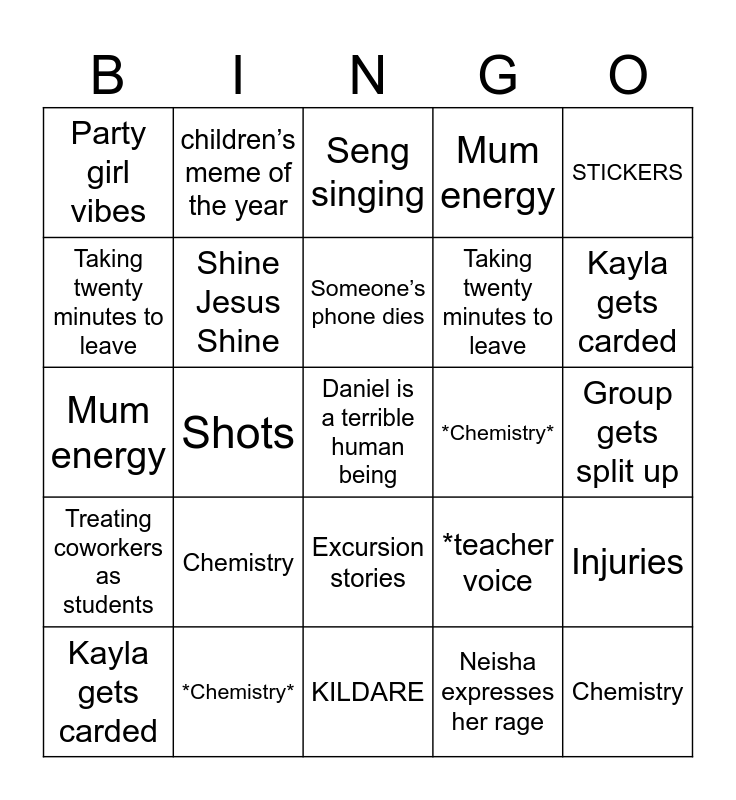 This bingo card has a free space and 57 words: Max feels threatened and threatens someone back, Kayla gets carded, Chi is dramatic, Party girl vibes, KILDARE, Necking a drink, Shine Jesus Shine, Group gets split up, Taking twenty minutes to leave, Ordering a drink just before needing to leave, Mum energy, Sweat, Treating coworkers as students, children’s meme of the year, Excursion stories, Outfit change, STICKERS, Shots, TMI, Chemistry, *Chemistry*, Violence, *teacher voice, Seng singing, Neisha expresses her rage, Someone’s phone dies, Wildlife, Max feels threatened and threatens someone back, Kayla gets carded, Chi is dramatic, Party girl vibes, KILDARE, Necking a drink, Shine Jesus Shine, Group gets split up, Taking twenty minutes to leave, Ordering a drink just before needing to leave, Mum energy, Sweat, Treating coworkers as students, children’s meme of the year, Excursion stories, Outfit change, STICKERS, Shots, TMI, Chemistry, *Chemistry*, Violence, *teacher voice, Seng singing, Neisha expresses her rage, Someone’s phone dies, Wildlife, *Bisexuality intensifies*, Injuries and You’re leaving already?.