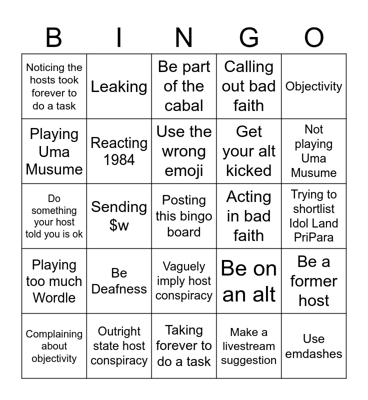 This bingo card has a free space and 24 words: Be Deafness, Outright state host conspiracy, Use the wrong emoji, Complaining about objectivity, Objectivity, Noticing the hosts took forever to do a task, Playing Uma Musume, Leaking, Acting in bad faith, Vaguely imply host conspiracy, Get your alt kicked, Do something your host told you is ok, Be on an alt, Be a former host, Reacting 1984, Make a livestream suggestion, Trying to shortlist Idol Land PriPara, Be part of the cabal, Not playing Uma Musume, Sending $w, Use emdashes, Playing too much Wordle, Calling out bad faith and Taking forever to do a task.