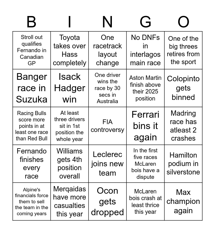 This bingo card has 25 words: Williams gets 4th position overall, Ocon gets dropped, One driver wins the race by 30 secs in Australia, Alpine's financials force them to sell the team in the coming years, One of the big threes retires from the sport, Stroll out qualifies Fernando in Canadian GP, Banger race in Suzuka, Toyota takes over Hass completely, Ferrari bins it again, Leclerec joins new team, Aston Martin finish above their 2025 position, Racing Bulls score more points in at least one race than Red Bull, In the first five races McLaren bois have a dispute, Hamilton podium in silverstone, Isack Hadger win, Max champion again, Madring race has atleast 2 crashes, One racetrack layout change, Colopinto gets binned, At least three drivers sit in 1st position the whole year, FIA controversy, Merqaidas have more casualties this year, Fernando finishes every race, No DNFs in interlagos main race and McLaren bois crash at least thrice this year.