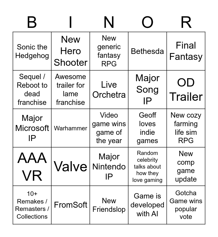 This bingo card has a free space and 24 words: Valve, FromSoft, Live Orchetra, 10+ Remakes / Remasters / Collections, Final Fantasy, Sonic the Hedgehog, Sequel / Reboot to dead franchise, New Hero Shooter, Geoff loves indie games, Major Nintendo IP, Major Song IP, Major Microsoft IP, Random celebrity talks about how they love gaming, New comp game update, Awesome trailer for lame franchise, Game is developed with AI, New cozy farming life sim RPG, New generic fantasy RPG, OD Trailer, Warhammer, Gotcha Game wins popular vote, AAA VR, Bethesda and New Friendslop.