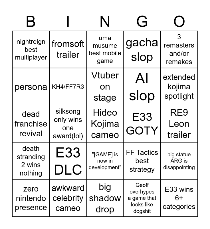 This bingo card has a free space and 24 words: E33 DLC, awkward celebrity cameo, Vtuber on stage, zero nintendo presence, 3 remasters and/or remakes, nightreign best multiplayer, persona, fromsoft trailer, E33 GOTY, "[GAME] is now in development", AI slop, dead franchise revival, FF Tactics best strategy, big statue ARG is disappointing, KH4/FF7R3, Geoff overhypes a game that looks like dogshit, RE9 Leon trailer, uma musume best mobile game, extended kojima spotlight, silksong only wins one award(lol), E33 wins 6+ categories, death stranding 2 wins nothing, gacha slop and big shadow drop.
