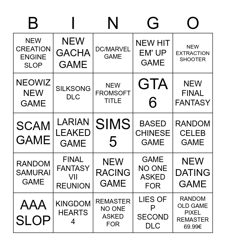 This bingo card has a free space and 24 words: FINAL FANTASY VII REUNION, KINGDOM HEARTS 4, NEW FROMSOFT TITLE, AAA SLOP, NEW EXTRACTION SHOOTER, NEW CREATION ENGINE SLOP, NEOWIZ NEW GAME, NEW GACHA GAME, BASED CHINESE GAME, NEW RACING GAME, GTA 6, SCAM GAME, GAME NO ONE ASKED FOR, NEW DATING GAME, SILKSONG DLC, LIES OF P SECOND DLC, RANDOM CELEB GAME, DC/MARVEL GAME, NEW FINAL FANTASY, LARIAN LEAKED GAME, RANDOM OLD GAME PIXEL REMASTER 69.99€, RANDOM SAMURAI GAME, NEW HIT EM' UP GAME and REMASTER NO ONE ASKED FOR.