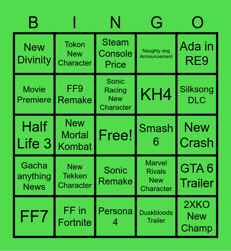 This bingo card has a free space and 24 words: FF7, New Tekken Character, Sonic Racing New Character, Duskbloods Trailer, Ada in RE9, New Divinity, Tokon New Character, Steam Console Price, Smash 6, New Crash, Half Life 3, FF9 Remake, Marvel Rivals New Character, GTA 6 Trailer, Movie Premiere, FF in Fortnite, Persona 4, Naughty dog Announcement, Silksong DLC, Gacha anything News, New Mortal Kombat, Sonic Remake, KH4 and 2XKO New Champ.