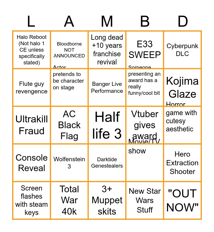 This bingo card has a free space and 45 words: 3 Top down games in row, "OUT NOW", New Chinese Extraction Shooter, Screen flashes with steam keys, Elder Scrolls 6 info/trailer/anything, New Star Wars Stuff, Long dead +10 years franchise revival, Copy of the statue appears on stage, Cyberpunk DLC, Total War 40k, E33 SWEEP, Vtuber gives award, Darktide Genestealers, Wolfenstein 3, Someone trips on stage, 3+ Muppet skits, Mass Effect, Ultrakill Fraud, Fallout 3 Remastered, Kojima Glaze, Bloodborne NOT ANNOUNCED, Space Marine 3, Cool boomer shooter, Halo Reboot (Not halo 1 CE unless specifically stated), Feels good industry message, Horror game with cutesy aesthetic, Hollywood Actor, Gears of war hype, Movie/TV show, Console Reveal, Cringe Segment, Hero Extraction Shooter, Titanfall/Dead Space, Mobile game segment, New Resident Evil Segment, AC Black Flag, Fable, 3+ Remakes/Remasters, David Cage, Banger Live Performance, Flute guy revengence, Someone presenting an award has a really funny/cool bit, New trailer for a game that doesn't add anything, Actor pretends to be character on stage and New IP from Big studio.