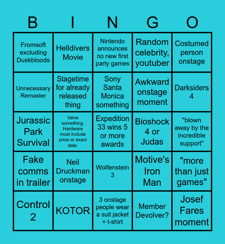 This bingo card has a free space and 38 words: Gacha game wins player's choice, Geoff makes physical contact with his husband Kojima, Audible audience member, Stagetime for already released thing, "more than just games", Neil Druckman onstage, Sony Santa Monica something, Mobile tie-in game, Costumed person onstage, Awkward onstage moment, Valve something. Hardware must include price or exact date., Random celebrity, youtuber, Josef Fares moment, "blown away by the incredible support", Unnecessary Remaster, Fake comms in trailer, Silksong wins nothing, Nintendo announces no new first party games, Life is Strange DE2, Bioshock 4 or Judas, Fromsoft excluding Duskbloods, KOTOR, Darksiders 4, Control 2, FF7Remake Part 3, 3 onstage people wear a suit jacket + t-shirt, Randy Pitchford Jumpscare, Elder Scrolls 6 or Fallout 3 Remaster, Persona 6 or P4R, Kingdom Hearts 4, Subnautica 2, Wolfenstein 3, Member Devolver?, Helldivers Movie, Black Flag Remake, Motive's Iron Man, Jurassic Park Survival and The Wolf Among us 2 or Dispatch 2.