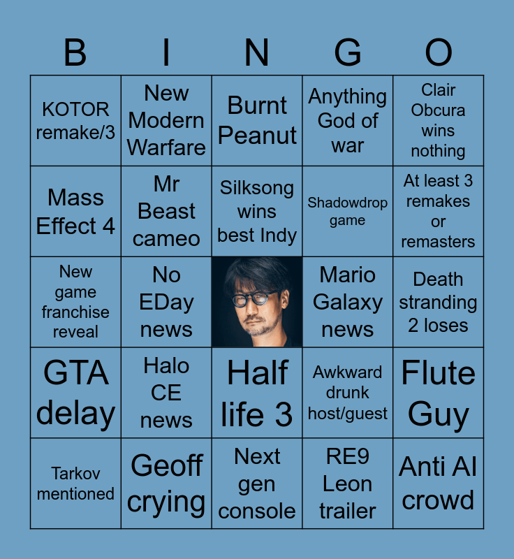 This bingo card has a free space and 24 words: Halo CE news, Geoff crying, Silksong wins best Indy, Tarkov mentioned, Clair Obcura wins nothing, KOTOR remake/3, Mass Effect 4, New Modern Warfare, Mario Galaxy news, Half life 3, Shadowdrop game, New game franchise reveal, Awkward drunk host/guest, Flute Guy, Mr Beast cameo, RE9 Leon trailer, Death stranding 2 loses, Burnt Peanut, At least 3 remakes or remasters, No EDay news, Anti AI crowd, GTA delay, Anything God of war and Next gen console.