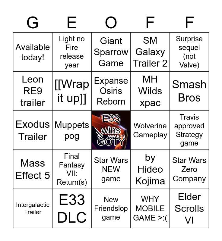 This bingo card has a free space and 24 words: Final Fantasy VII: Return(s), E33 DLC, Expanse Osiris Reborn, Intergalactic Trailer, Surprise sequel (not Valve), Available today!, Leon RE9 trailer, Light no Fire release year, Wolverine Gameplay, Star Wars NEW game, MH Wilds xpac, Exodus Trailer, by Hideo Kojima, Star Wars Zero Company, [[Wrap it up]], WHY MOBILE GAME >:(, Travis approved Strategy game, Giant Sparrow Game, Smash Bros, Muppets pog, Elder Scrolls VI, Mass Effect 5, SM Galaxy Trailer 2 and New Friendslop game.