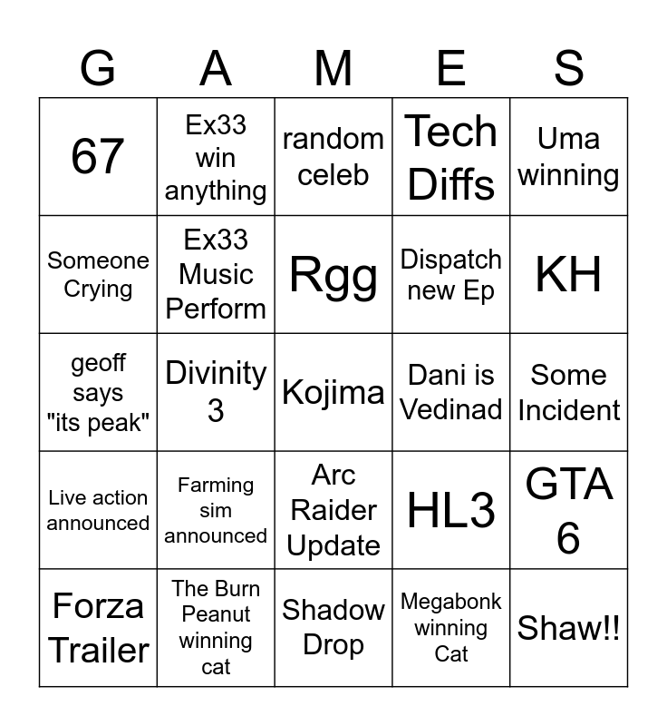 This bingo card has a free space and 24 words: Farming sim announced, The Burn Peanut winning cat, Rgg, Forza Trailer, Uma winning, 67, Someone Crying, Ex33 win anything, Dani is Vedinad, Arc Raider Update, Dispatch new Ep, geoff says "its peak", HL3, GTA 6, Ex33 Music Perform, Megabonk winning Cat, Some Incident, random celeb, KH, Divinity 3, Shaw!!, Live action announced, Tech Diffs and Shadow Drop.