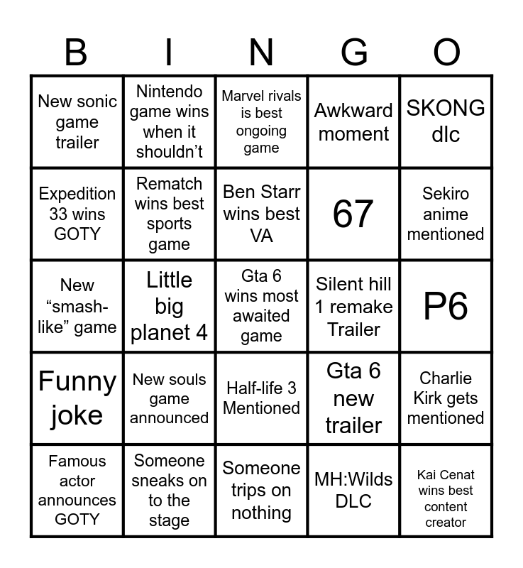 This bingo card has a free space and 24 words: New souls game announced, Someone sneaks on to the stage, Ben Starr wins best VA, Famous actor announces GOTY, SKONG dlc, New sonic game trailer, Expedition 33 wins GOTY, Nintendo game wins when it shouldn’t, Silent hill 1 remake Trailer, Half-life 3 Mentioned, 67, New “smash-like” game, Gta 6 new trailer, Charlie Kirk gets mentioned, Rematch wins best sports game, MH:Wilds DLC, P6, Marvel rivals is best ongoing game, Sekiro anime mentioned, Little big planet 4, Kai Cenat wins best content creator, Funny joke, Awkward moment and Someone trips on nothing.