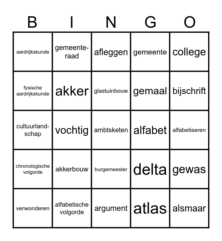 This bingo card has a free space and 29 words: verwonderen, vlak, vochtig, volgorde, aardrijkskunde, afleggen, akker, akkerbouw, alfabet, alfabetische volgorde, alfabetiseren, alsmaar, argument, atlas, bijschrift, buitenland, burgemeester, chronologische volgorde, college, cultuurland- schap, delta, fragment, gemaal, fysische aardrijkskunde, gemeente, gemeente- raad, gewas, glastuinbouw and gletsjer.