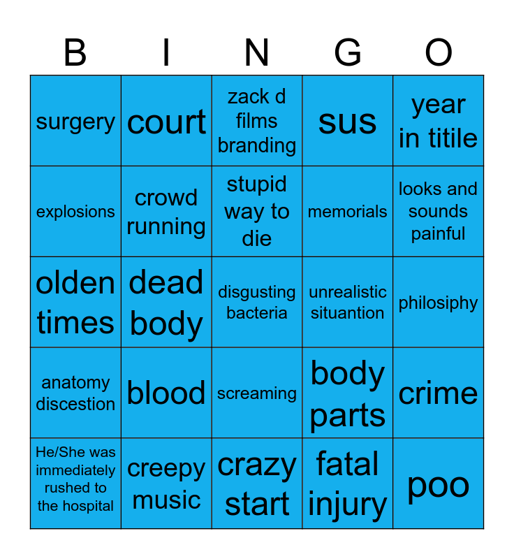 This bingo card has a free space and 24 words: He/She was immediately rushed to the hospital, blood, stupid way to die, fatal injury, year in titile, surgery, court, zack d films branding, unrealistic situantion, philosiphy, olden times, crowd running, body parts, crime, explosions, creepy music, crazy start, sus, looks and sounds painful, anatomy discestion, dead body, screaming, memorials and poo.