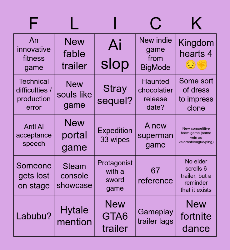 This bingo card has a free space and 24 words: Steam console showcase, Hytale mention, Stray sequel?, Labubu?, Kingdom hearts 4 😔✊, An innovative fitness game, Technical difficulties / production error, New fable trailer, A new superman game, Protagonist with a sword game, Haunted chocolatier release date?, Anti Ai acceptance speech, 67 reference, No elder scrolls 6 trailer, but a reminder that it exists, New souls like game, Gameplay trailer lags, New competitive team game (same vein as valorant/league/ping), Ai slop, Some sort of dress to impress clone, New portal game, New fortnite dance, Someone gets lost on stage, New indie game from BigMode and New GTA6 trailer.
