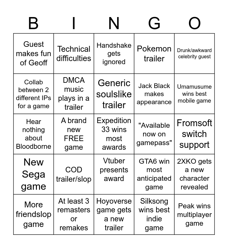 This bingo card has 25 words: New Sega game, At least 3 remasters or remakes, Expedition 33 wins most awards, Silksong wins best indie game, Drunk/awkward celebrity guest, Guest makes fun of Geoff, Technical difficulties, Handshake gets ignored, "Available now on gamepass", 2XKO gets a new character revealed, Collab between 2 different IPs for a game, DMCA music plays in a trailer, Hoyoverse game gets a new trailer, GTA6 win most anticipated game, Umamusume wins best mobile game, More friendslop game, A brand new FREE game, Generic soulslike trailer, Jack Black makes appearance, Fromsoft switch support, Hear nothing about Bloodborne, COD trailer/slop, Vtuber presents award, Pokemon trailer and Peak wins multiplayer game.