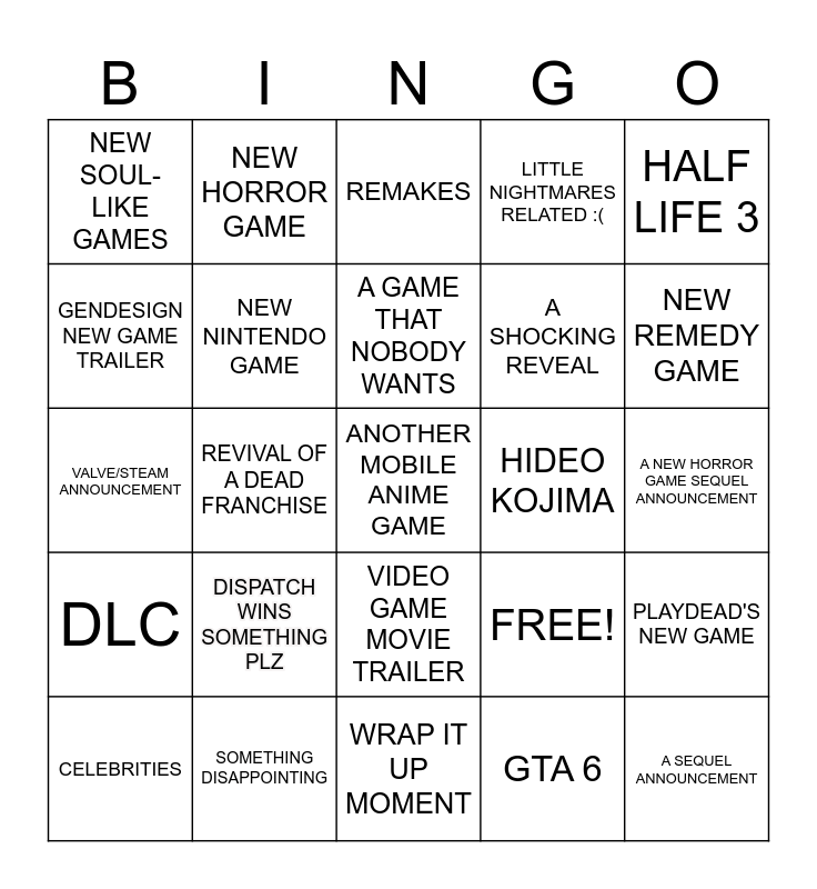 This bingo card has 25 words: DISPATCH WINS SOMETHING PLZ, WRAP IT UP MOMENT, A GAME THAT NOBODY WANTS, CELEBRITIES, HALF LIFE 3, NEW SOUL-LIKE GAMES, GENDESIGN NEW GAME TRAILER, NEW HORROR GAME, HIDEO KOJIMA, VIDEO GAME MOVIE TRAILER, A SHOCKING REVEAL, VALVE/STEAM ANNOUNCEMENT, FREE!, PLAYDEAD'S NEW GAME, NEW NINTENDO GAME, A SEQUEL ANNOUNCEMENT, A NEW HORROR GAME SEQUEL ANNOUNCEMENT, REMAKES, NEW REMEDY GAME, REVIVAL OF A DEAD FRANCHISE, ANOTHER MOBILE ANIME GAME, SOMETHING DISAPPOINTING, DLC, LITTLE NIGHTMARES RELATED :( and GTA 6.