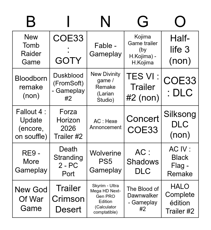 This bingo card has a free space and 24 words: Death Stranding 2 - PC Port, Trailer Crimson Desert, New Divinity game / Remake (Larian Studio), New God Of War Game, Half-life 3 (non), New Tomb Raider Game, Bloodborn remake (non), COE33 : GOTY, Concert COE33, Wolverine PS5 Gameplay, TES VI : Trailer #2 (non), Fallout 4 : Update (encore, on souffle), AC : Shadows DLC, AC IV : Black Flag - Remake, Duskblood (FromSoft) - Gameplay #2, The Blood of Dawnwalker - Gameplay #2, Silksong DLC (non), Fable - Gameplay, COE33 : DLC, Forza Horizon 2026 Trailer #2, HALO Complete édition Trailer #2, RE9 - More Gameplay, Kojima Game trailer (by H.Kojima) - H.Kojima and Skyrim - Ultra Mega HD Next-Gen PRO Edition (Calculator comptatible).