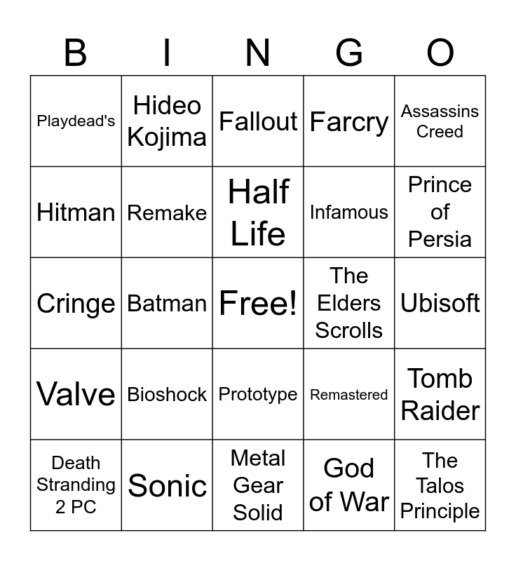 This bingo card has a free space and 24 words: Death Stranding 2 PC, Bioshock, Half Life, God of War, Assassins Creed, Playdead's, Hideo Kojima, Fallout, The Elders Scrolls, Ubisoft, Cringe, Remake, Remastered, Tomb Raider, Hitman, Sonic, Metal Gear Solid, Farcry, Prince of Persia, Valve, Batman, Prototype, Infamous and The Talos Principle.