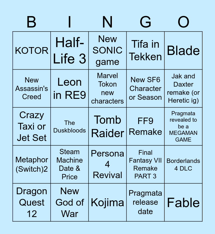 This bingo card has a free space and 24 words: Dragon Quest 12, Steam Machine Date & Price, Marvel Tokon new characters, Pragmata release date, Blade, KOTOR, Half-Life 3, New SONIC game, FF9 Remake, Pragmata revealed to be a MEGAMAN GAME, Crazy Taxi or Jet Set, Leon in RE9, Final Fantasy VII Remake PART 3, Borderlands 4 DLC, New Assassin's Creed, New God of War, Kojima, Tifa in Tekken, Jak and Daxter remake (or Heretic ig), Metaphor (Switch)2, The Duskbloods, Persona 4 Revival, New SF6 Character or Season and Fable.