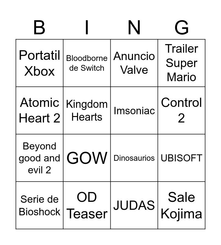 This bingo card has 16 words: OD Teaser, UBISOFT, Anuncio Valve, Portatil Xbox, Beyond good and evil 2, Bloodborne de Switch, Dinosaurios, JUDAS, Atomic Heart 2, Kingdom Hearts, Serie de Bioshock, Trailer Super Mario, GOW, Control 2, Imsoniac and Sale Kojima.