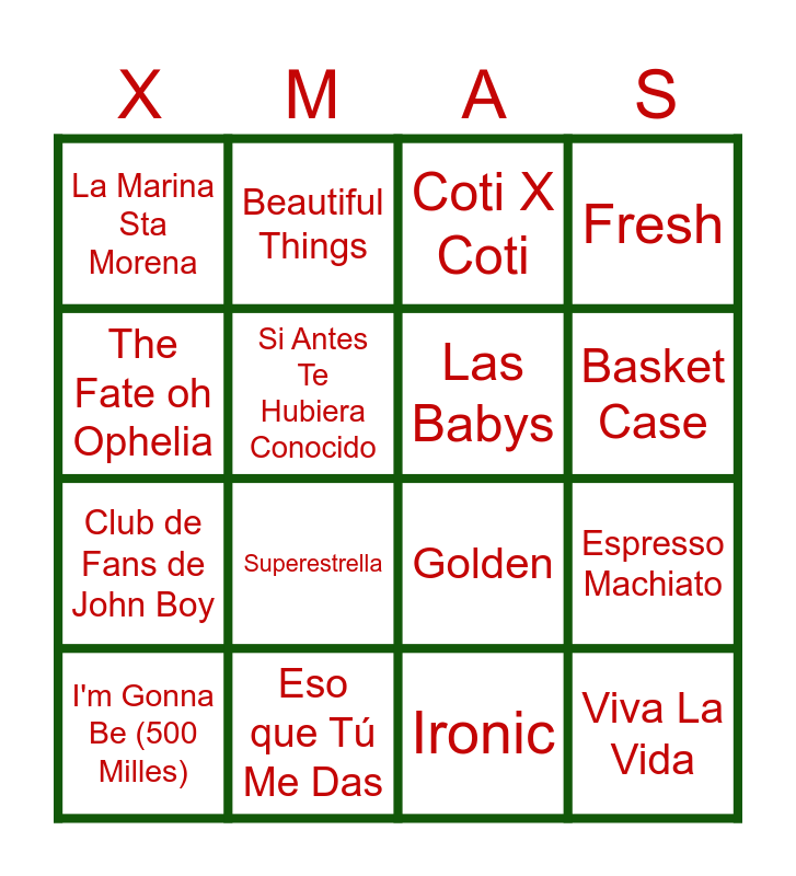This bingo card has 41 words: Free!, Golden, Soda Pop, Las Babys, Wannabe, Baby one more time, Basket Case, De ellos aprendí, The Fate oh Ophelia, Viva La Vida, Espresso Machiato, Fresh, I'm Gonna Be (500 Milles), Ironic, Eso que Tú Me Das, Single Ladies (Put a Ring On It), Mamma Mia, La Marina Sta Morena, Sta Guai, Coti X Coti, I Gotta Feeling, Walking On Sunshine, It's Gotta Be You, Club de Fans de John Boy, La Morocha, APT., Colgando en tus manos, La Bilirrubina, Superestrella, Radetzky March, Capaz, Beautiful Things, Believe, I'm a Believer, I Will Survive, Si Antes Te Hubiera Conocido, Eye of the Tiger, I'll be There for You, La Camisa Negra, Alors on danse and Me Gustas Tu.