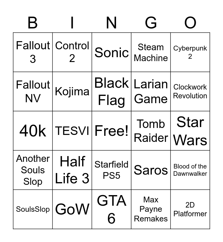 This bingo card has a free space and 24 words: Half Life 3, GoW, Black Flag, SoulsSlop, Cyberpunk 2, Fallout 3, Fallout NV, Control 2, Tomb Raider, Starfield PS5, Larian Game, 40k, Saros, Blood of the Dawnwalker, Kojima, Max Payne Remakes, Star Wars, Sonic, Clockwork Revolution, TESVI, 2D Platformer, Another Souls Slop, Steam Machine and GTA 6.