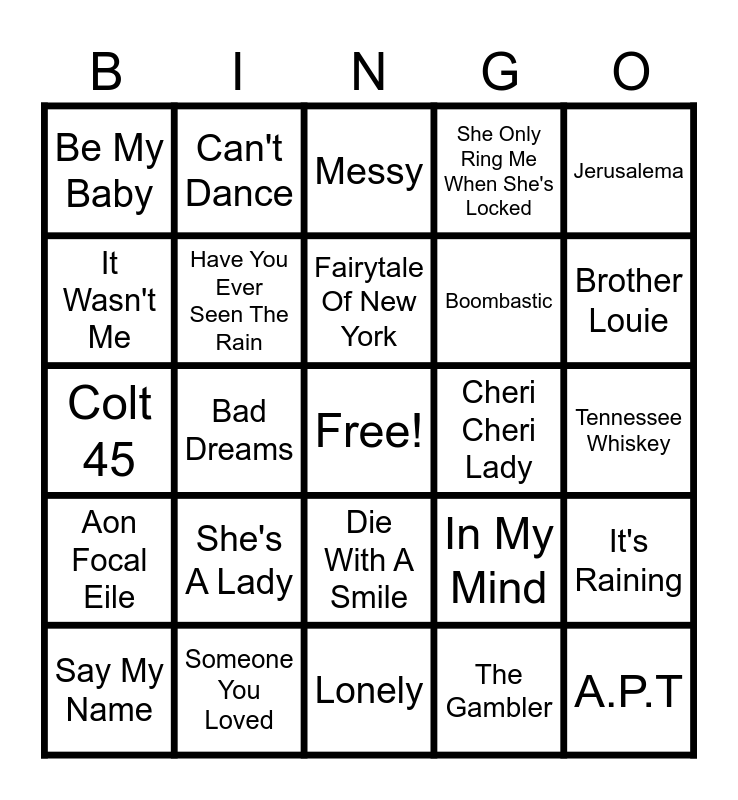 This bingo card has a free space and 29 words: Say My Name, Words, Bad Dreams, Father Figure, Be My Baby, Messy, Have You Ever Seen The Rain, She's A Lady, Cheri Cheri Lady, Someone You Loved, Tennessee Whiskey, A.P.T, Lonely, The Gambler, Brother Louie, Last Christmas, Die With A Smile, Aon Focal Eile, Jerusalema, Colt 45, In My Mind, Don't Call Me Up, Boombastic, It Wasn't Me, She Only Ring Me When She's Locked, Can't Dance, It's Raining, Fairytale Of New York and Rich Men North Of Richmond.