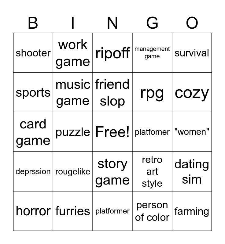 This bingo card has a free space and 24 words: rougelike, furries, friend slop, horror, survival, shooter, sports, work game, platfomer, story game, rpg, card game, retro art style, dating sim, music game, person of color, "women", ripoff, cozy, puzzle, farming, deprssion, management game and platformer.