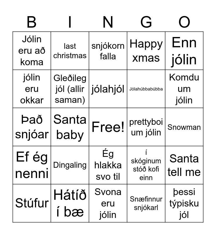 This bingo card has a free space and 24 words: Dingaling, Hátíð í bæ, jólahjól, Stúfur, Enn jólin, Jólin eru að koma, jólin eru okkar, last christmas, prettyboi um jólin, Ég hlakka svo til, Jólahúbbabúbba, Það snjóar, í skóginum stóð kofi einn, Santa tell me, Gleðileg jól (allir saman), Snæfinnur snjókarl, Snowman, snjókorn falla, Komdu um jólin, Santa baby, þessi týpisku jól, Ef ég nenni, Happy xmas and Svona eru jólin.