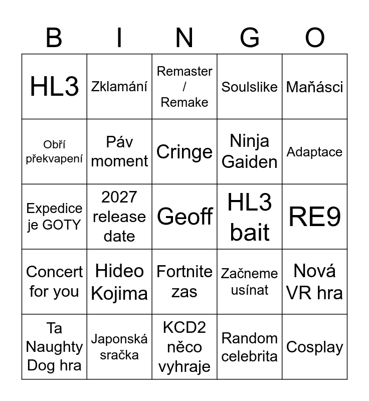 This bingo card has a free space and 24 words: Hideo Kojima, Japonská sračka, Cringe, Ta Naughty Dog hra, Maňásci, HL3, Obří překvapení, Zklamání, HL3 bait, Fortnite zas, Ninja Gaiden, Expedice je GOTY, Začneme usínat, Nová VR hra, Páv moment, Random celebrita, RE9, Remaster / Remake, Adaptace, 2027 release date, Cosplay, Concert for you, Soulslike and KCD2 něco vyhraje.