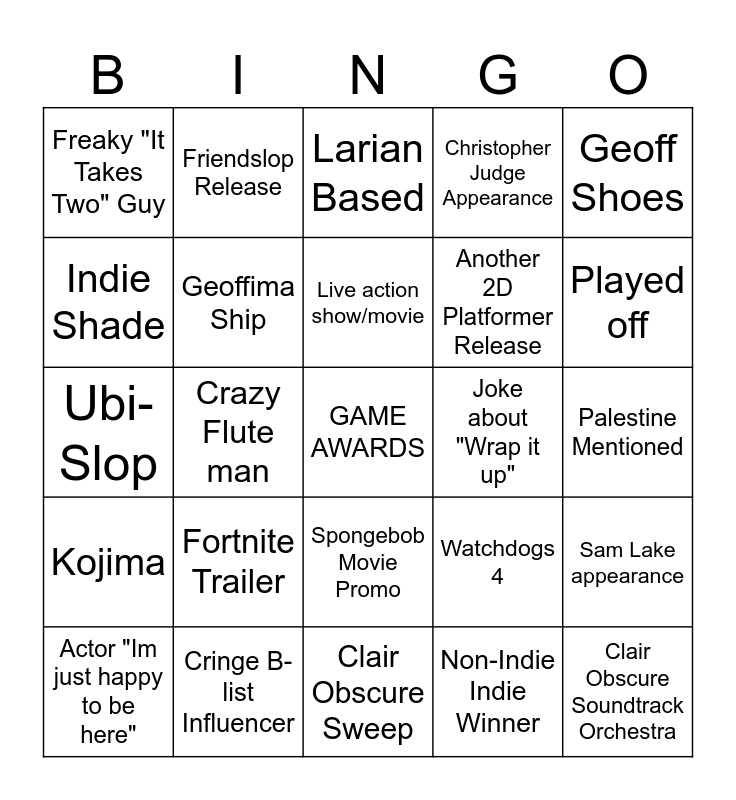 This bingo card has a free space and 24 words: Fortnite Trailer, Cringe B-list Influencer, Live action show/movie, Actor "Im just happy to be here", Geoff Shoes, Freaky "It Takes Two" Guy, Indie Shade, Friendslop Release, Joke about "Wrap it up", Spongebob Movie Promo, Another 2D Platformer Release, Ubi-Slop, Watchdogs 4, Sam Lake appearance, Geoffima Ship, Non-Indie Indie Winner, Palestine Mentioned, Larian Based, Played off, Crazy Flute man, Clair Obscure Soundtrack Orchestra, Kojima, Christopher Judge Appearance and Clair Obscure Sweep.