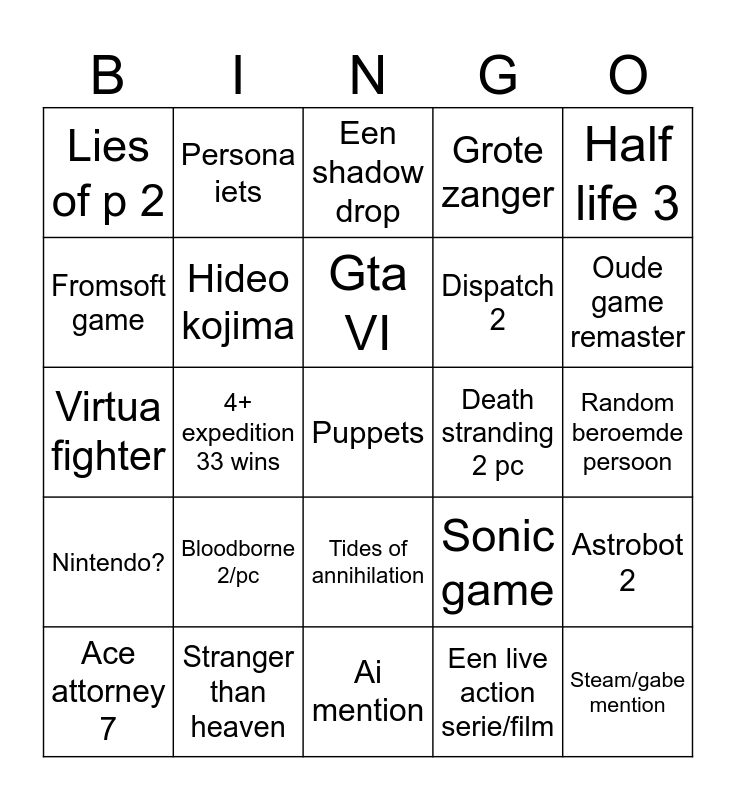 This bingo card has a free space and 24 words: Bloodborne 2/pc, Stranger than heaven, Gta VI, Ace attorney 7, Half life 3, Lies of p 2, Fromsoft game, Persona iets, Death stranding 2 pc, Tides of annihilation, Dispatch 2, Virtua fighter, Sonic game, Astrobot 2, Hideo kojima, Een live action serie/film, Random beroemde persoon, Een shadow drop, Oude game remaster, 4+ expedition 33 wins, Steam/gabe mention, Nintendo?, Grote zanger and Ai mention.