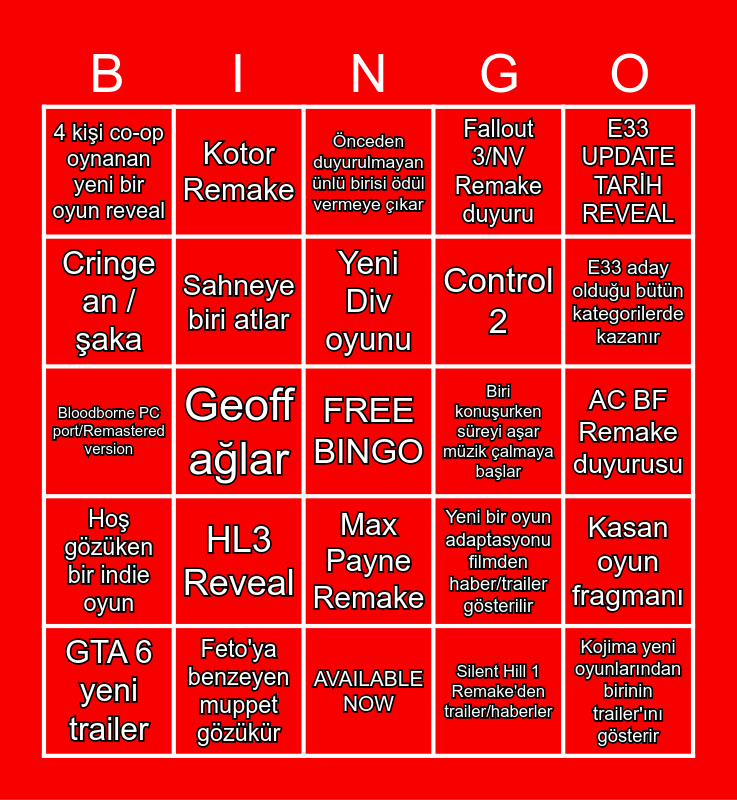 This bingo card has a free space and 24 words: HL3 Reveal, Feto'ya benzeyen muppet gözükür, Yeni Div oyunu, GTA 6 yeni trailer, E33 UPDATE TARİH REVEAL, 4 kişi co-op oynanan yeni bir oyun reveal, Cringe an /şaka, Kotor Remake, Biri konuşurken süreyi aşar müzik çalmaya başlar, Max Payne Remake, Control 2, Bloodborne PC port/Remastered version, Yeni bir oyun adaptasyonu filmden haber/trailer gösterilir, Kasan oyun fragmanı, Sahneye biri atlar, Silent Hill 1 Remake'den trailer/haberler, AC BF Remake duyurusu, Önceden duyurulmayan ünlü birisi ödül vermeye çıkar, E33 aday olduğu bütün kategorilerde kazanır, Geoff ağlar, Kojima yeni oyunlarından birinin trailer'ını gösterir, Hoş gözüken bir indie oyun, Fallout 3/NV Remake duyuru and AVAILABLE NOW.