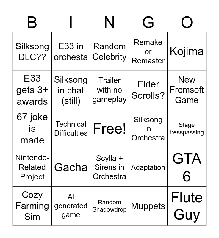 This bingo card has a free space and 24 words: Gacha, Ai generated game, Trailer with no gameplay, Cozy Farming Sim, Kojima, Silksong DLC??, E33 gets 3+ awards, E33 in orchesta, Silksong in Orchestra, Scylla + Sirens in Orchestra, Elder Scrolls?, 67 joke is made, Adaptation, GTA 6, Silksong in chat (still), Muppets, Stage tresspassing, Random Celebrity, New Fromsoft Game, Technical Difficulties, Flute Guy, Nintendo-Related Project, Remake or Remaster and Random Shadowdrop.