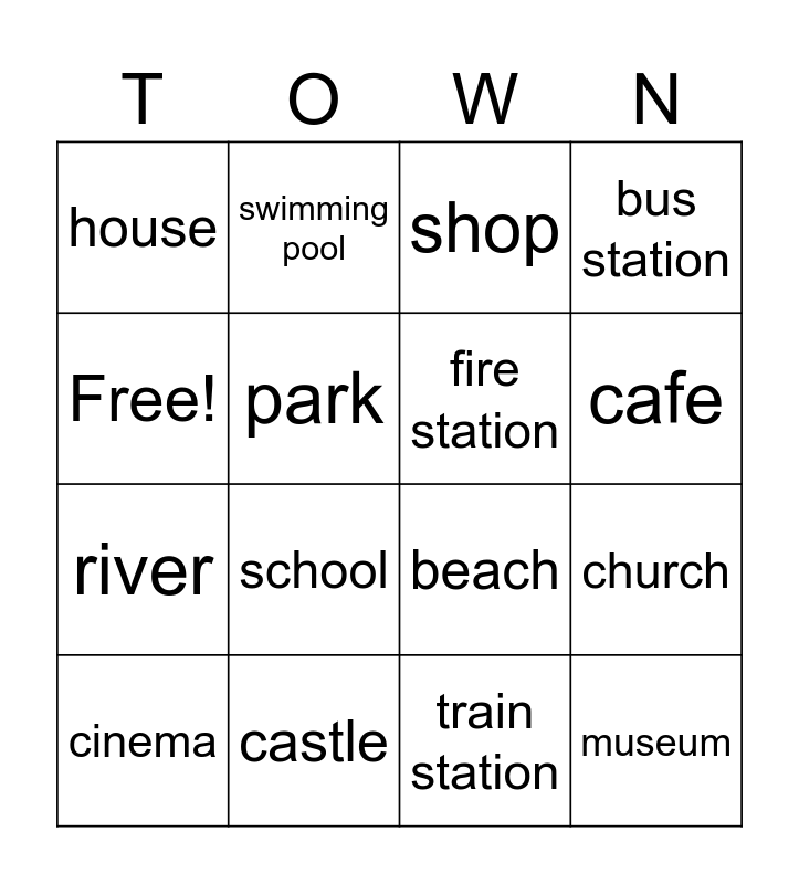 This bingo card has 16 words: castle, church, shop, house, river, swimming pool, beach, train station, Free!, park, cinema, bus station, school, cafe, fire station and museum.