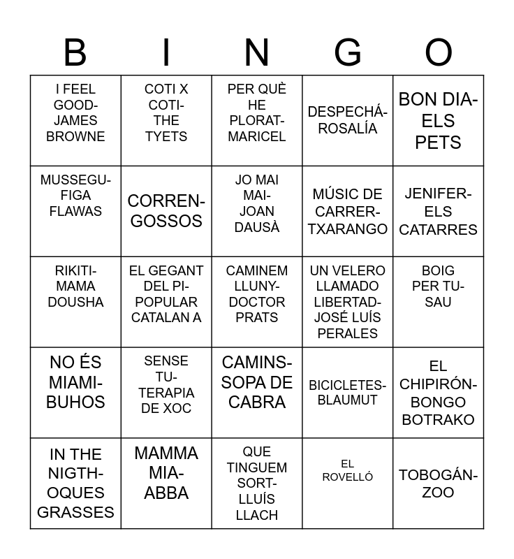This bingo card has 25 words: SENSE TU- TERAPIA DE XOC, QUE TINGUEM SORT- LLUÍS LLACH, JO MAI MAI- JOAN DAUSÀ, IN THE NIGTH- OQUES GRASSES, BON DIA- ELS PETS, I FEEL GOOD- JAMES BROWNE, MUSSEGU- FIGA FLAWAS, COTI X COTI- THE TYETS, UN VELERO LLAMADO LIBERTAD- JOSÉ LUÍS PERALES, CAMINS- SOPA DE CABRA, MÚSIC DE CARRER- TXARANGO, RIKITI- MAMA DOUSHA, BICICLETES- BLAUMUT, EL CHIPIRÓN- BONGO BOTRAKO, CORREN- GOSSOS, TOBOGÁN- ZOO, BOIG PER TU- SAU, PER QUÈ HE PLORAT- MARICEL, JENIFER- ELS CATARRES, EL GEGANT DEL PI- POPULAR CATALAN A, CAMINEM LLUNY- DOCTOR PRATS, MAMMA MIA- ABBA, NO ÉS MIAMI- BUHOS, DESPECHÁ- ROSALÍA and EL ROVELLÓ.