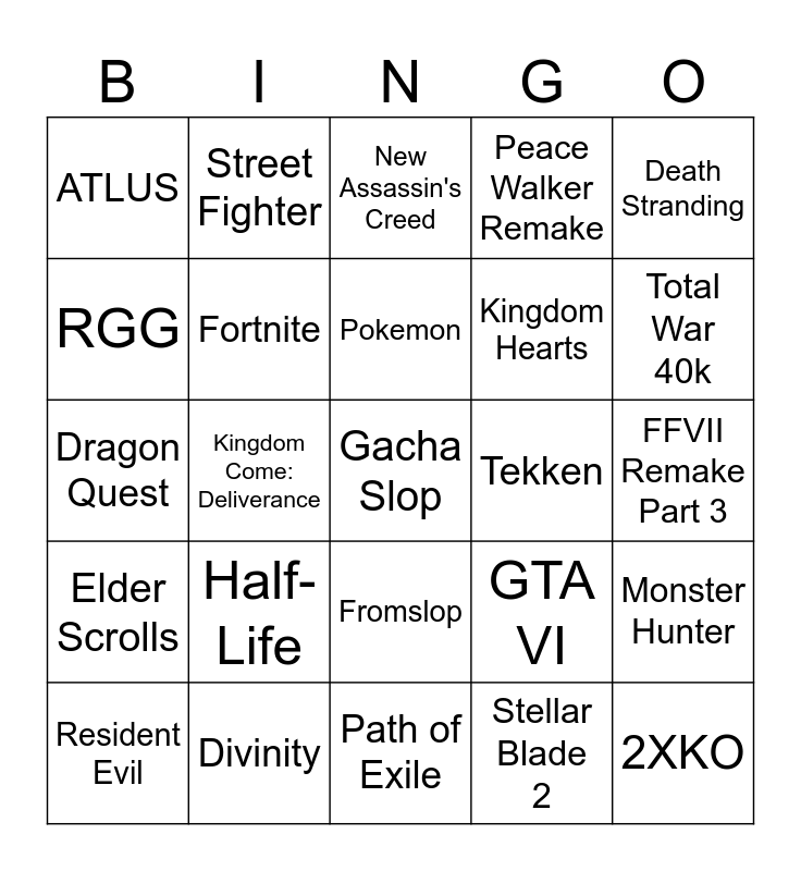 This bingo card has a free space and 24 words: Half-Life, Divinity, Pokemon, Resident Evil, Death Stranding, ATLUS, RGG, Street Fighter, Tekken, Fromslop, Kingdom Hearts, Dragon Quest, GTA VI, Monster Hunter, Fortnite, Stellar Blade 2, FFVII Remake Part 3, New Assassin's Creed, Total War 40k, Kingdom Come: Deliverance, 2XKO, Elder Scrolls, Peace Walker Remake and Path of Exile.