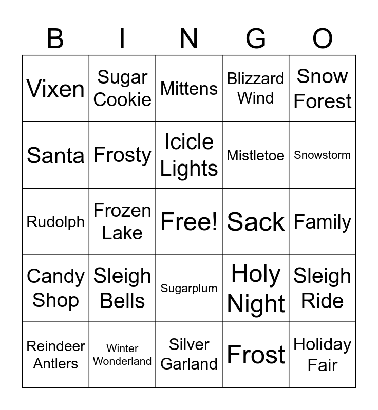 This bingo card has a free space and 296 words: Christmas, Santa, Reindeer, Sleigh, Elf, Stocking, Present, Ornament, Tree, Candy Cane, Wreath, Snowflake, Snowman, North Pole, Fireplace, Gingerbread, Star, Holly, Bells, Caroling, Mistletoe, Chimney, Ribbon, Tinsel, Garland, Nutcracker, Angel,, Christmas, Santa, Reindeer, Sleigh, Elf, Stocking, Present, Ornament, Tree, Candy Cane, Wreath, Snowflake, Snowman, North Pole, Fireplace, Gingerbread, Star, Holly, Bells, Caroling, Mistletoe, Chimney, Ribbon, Tinsel, Garland, Nutcracker, Angel, Cookies, Hot Cocoa, Eggnog, Lights, Frost, Blizzard, Scrooge, Grinch, Peace, Joy, Merry, Winter, Noel, Poinsettia, Sled, Toy Shop, Reins, Workshop, Sack, Chimney Sweep, Reindeer Food, Christmas Eve, Christmas Day, Fireplace Mantel, Evergreen, Snowdrift, Icicle, Frostbite, Igloo, Sleigh Bells, Yule Log, Yule, Advent, Nativity, Bethlehem, Shepherd, Wise Men, Star of David, Carols, Carolers, Choir, Midnight Mass, Candy, Peppermint, Fruitcake, Gingerbread Man, Gingerbread House, Chestnuts, Feast, Roast Turkey, Cranberries, Plum Pudding, Sugarplum, Hot Apple Cider, Mulled Wine, Winter Coat, Mittens, Boots, Scarf, Earmuffs, Hat, Snowball, Snowstorm, Snow Angel, Snow Globe, Ice Skates, Ice Rink, Frozen Pond, Pinecone, Garland Lights, Bauble, Christmas Card, Gift Wrap, Tape, Bow, Gift Tag, Fireplace Stocking, Reindeer Stable, Santa Suit, Santa Hat, Santa Boots, Red Nose, Rudolph, Dasher, Dancer, Prancer, Vixen, Comet, Cupid, Donner, Blitzen, Midnight, Blizzard Wind, Evergreen Forest, Sleigh Ride, Candy Shop, Toy Factory, Holiday Market, Gingerbread Village, Snow Trail, Winter Wonderland, Holiday Spirit, Miracle, Family, Gathering, Tradition, Celebration, Cheer, Goodwill, Rejoice, Festive, Season’s Greetings, Trees, North Star, Manger, Christmas Story, Candle, Lantern, Christmas Wish, Wish List, Naughty List, Nice List, Christmas Magic, Chimney Smoke, Cozy Blanket, Snow Boots, Winter Night, Winter Sky, Reindeer Antlers, Stocking Stuffer, Wrapping Paper, Snowflake Cookie, Star Cookie, Jingle Bells, North Pole Mail, Santa’s List, Sleigh Tracks, Ice Crystals, Snowfall, Silent Night, Holy Night, Reindeer Games, Frosty, Tasty Treats, Nutmeg, Cinnamon, Vanilla, Sugar Cookie, Candy Ribbon, Gumdrops, Marshmallows, Hot Chocolate Mix, Fireplace Logs, Crackling Fire, Winter Cabin, Snowy Forest, Snow Village, Toy Train, Model Train, Christmas Parade, Carol Book, Christmas Music, Holiday Movie, Snowy Path, Winter Morning, Ice Sculpture, Snow Lantern, Christmas Socks, Christmas Pajamas, Holiday Sweater, Ugly Sweater, Golden Star, Silver Bells, Reindeer Sleigh, Gift Box, Gift Basket, Surprise Gift, Midnight Snow, Winter Breeze, Sparkle, Glitter, Snow Dust, Snow Tracks, Tree Topper, Star Topper, Angel Topper, Tree Skirt, Christmas Market, Nutcracker Soldier, Sugarplum Fairy, Toy Drum, Candy Cane Lane, Snowy Hills, Ice Castle, Frozen Lake, Sleigh Driver, Santa’s Helpers, Christmas Countdown, Advent Calendar, Reindeer Barn, Magic Dust, Holiday Lights, Light Show, Winter Street, Ice Lights, Christmas Cookies, Festive Feast, Holiday Crafts, Pine Branch, Holly Berries, Ginger Snap, Holiday Stocking, Candy Jar, Nut Bowl, Hot Drinks, Pine Needles, Winter Hat, Icicle Lights, Snowshoe, Sled Ride, Snow Fort, Christmas Castle, Wrapped Gift, Silver Garland, Gold Garland, Evergreen Wreath, Winter Pine, Winter Woods, Snow Forest, Christmas Ornament Box, Holiday Tune, Seasonal Joy, Holly Leaf, Christmas Treats, Winter Spark, Christmas Cheer, Gift Exchange, White Christmas, Christmas Spirit, Tree Lights, Holiday Baking, Reindeer Call, Santa’s Workshop, Snowy Window, Frosted Glass, Holiday Fair, Christmas Bell, Snow Peak, Winter Cottage, North Wind, Holiday Season, Christmas Lantern, Storybook, Christmas Dream, Christmas Carol, Winter Song, Peaceful Night, Mistletoe Kiss, Reindeer Trail, Candlelight, Festive Glow, Fireplace Hearth, Winter Mug, Christmas Morning, Holiday Surprise, Winter Shadow, Night Star and Christmas Miracle.
