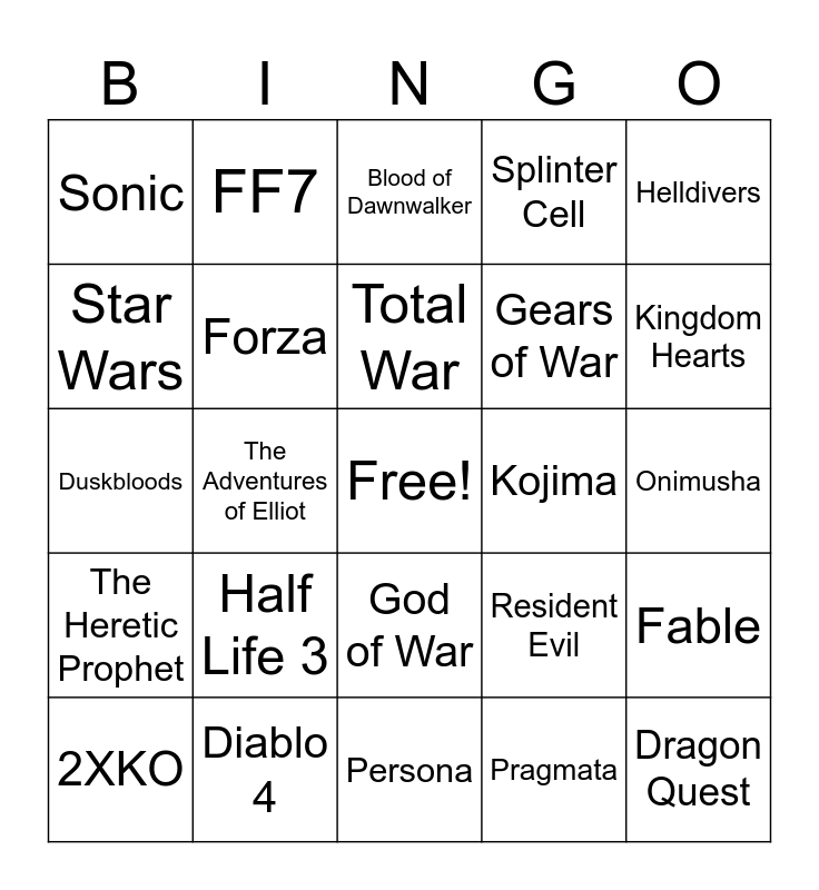 This bingo card has a free space and 24 words: Half Life 3, Diablo 4, Total War, 2XKO, Helldivers, Sonic, Star Wars, FF7, Kojima, God of War, Gears of War, Duskbloods, Resident Evil, Fable, Forza, Pragmata, Onimusha, Blood of Dawnwalker, Kingdom Hearts, The Adventures of Elliot, Dragon Quest, The Heretic Prophet, Splinter Cell and Persona.