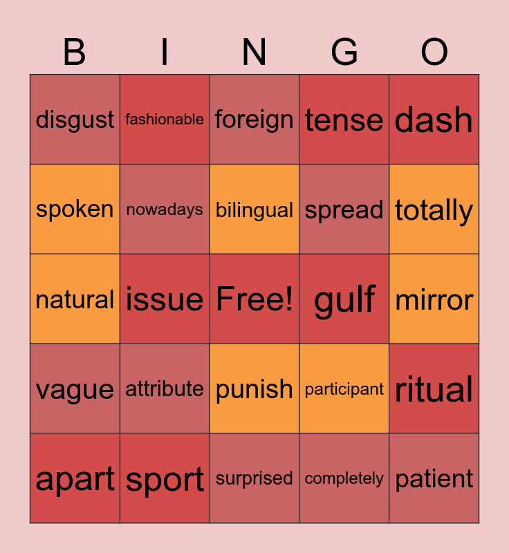 This bingo card has a free space and 24 words: apart, attribute, bilingual, completely, dash, disgust, fashionable, foreign, gulf, mirror, natural, nowadays, participant, ritual, spoken, sport, surprised, tense, totally, vague, issue, punish, spread and patient.