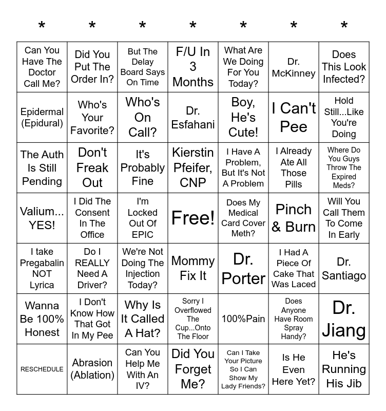This bingo card has a free space and 48 words: 100%Pain, I Can't Pee, Did You Forget Me?, I Did The Consent In The Office, It's Probably Fine, Will You Call Them To Come In Early, Did You Put The Order In?, Abrasion (Ablation), Dr. McKinney, Mommy Fix It, Does This Look Infected?, F/U In 3 Months, I Already Ate All Those Pills, I Have A Problem, But It's Not A Problem, Wanna Be 100% Honest, Pinch & Burn, Epidermal (Epidural), Hold Still...Like You're Doing, Does Anyone Have Room Spray Handy?, What Are We Doing For You Today?, Boy, He's Cute!, I'm Locked Out Of EPIC, Can You Have The Doctor Call Me?, Who's Your Favorite?, Dr. Jiang, Who's On Call?, Where Do You Guys Throw The Expired Meds?, RESCHEDULE, Kierstin Pfeifer, CNP, Don't Freak Out, Is He Even Here Yet?, Does My Medical Card Cover Meth?, Dr. Santiago, I Don't Know How That Got In My Pee, Valium... YES!, Dr. Porter, I Had A Piece Of Cake That Was Laced, The Auth Is Still Pending, We're Not Doing The Injection Today?, Why Is It Called A Hat?, I take Pregabalin NOT Lyrica, He's Running His Jib, But The Delay Board Says On Time, Can You Help Me With An IV?, Dr. Esfahani, Sorry I Overflowed The Cup...Onto The Floor, Do I REALLY Need A Driver? and Can I Take Your Picture So I Can Show My Lady Friends?.