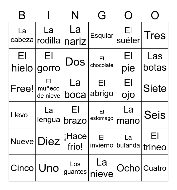 This bingo card has 36 words: El invierno, ¡Hace frío!, La nieve, El hielo, Llevo..., El abrigo, El gorro, Los guantes, El suéter, La bufanda, Las botas, Esquiar, El trineo, El muñeco de nieve, El chocolate, La cabeza, Nueve, El ojo, Free!, La nariz, La boca, La lengua, El estomago, El brazo, La mano, La rodilla, El pie, Uno, Dos, Tres, Cuatro, Cinco, Seis, Siete, Diez and Ocho.