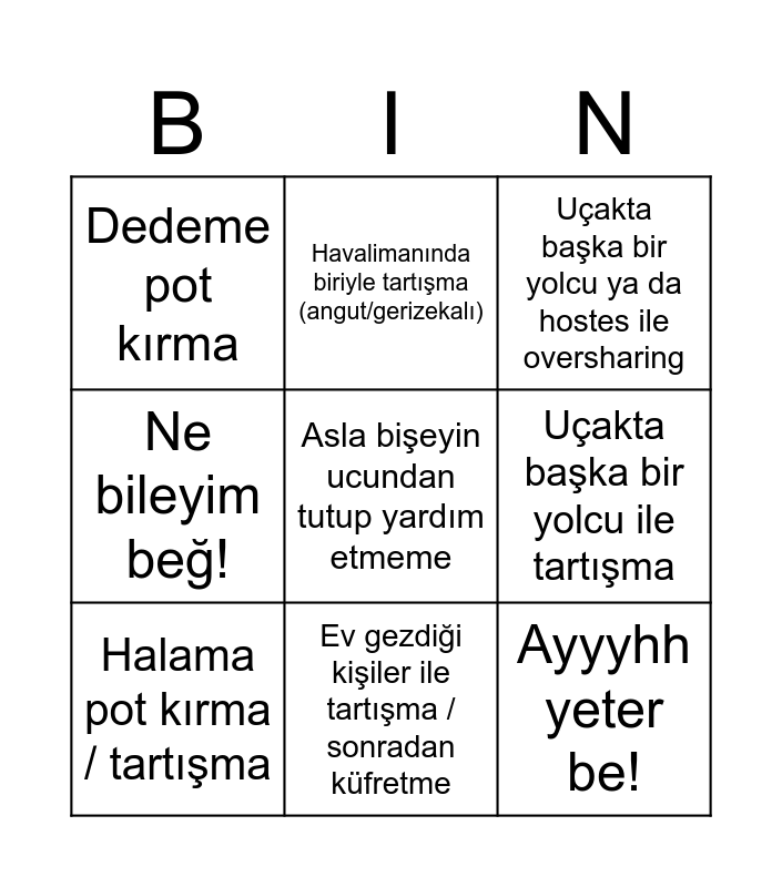This bingo card has a free space and 8 words: Uçakta başka bir yolcu ile tartışma, Uçakta başka bir yolcu ya da hostes ile oversharing, Havalimanında biriyle tartışma (angut/gerizekalı), Halama pot kırma / tartışma, Dedeme pot kırma, Ayyyhh yeter be!, Ne bileyim beğ! and Ev gezdiği kişiler ile tartışma / sonradan küfretme.