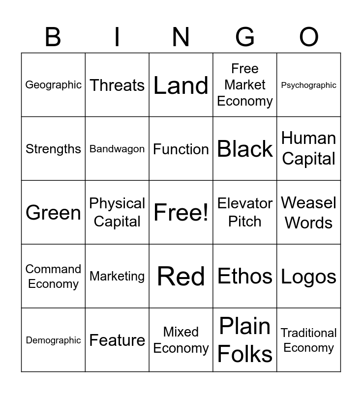 This bingo card has a free space and 24 words: Marketing, Feature, Function, Demographic, Psychographic, Geographic, Strengths, Threats, Elevator Pitch, Red, Black, Green, Ethos, Logos, Bandwagon, Plain Folks, Weasel Words, Land, Human Capital, Physical Capital, Traditional Economy, Command Economy, Free Market Economy and Mixed Economy.