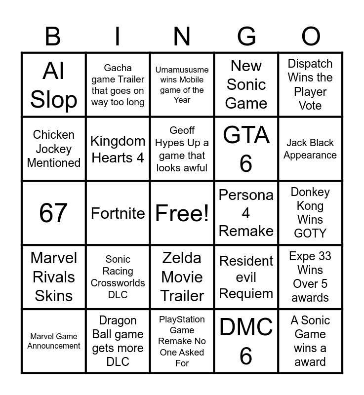 This bingo card has a free space and 24 words: Sonic Racing Crossworlds DLC, Dragon Ball game gets more DLC, Geoff Hypes Up a game that looks awful, Marvel Game Announcement, Dispatch Wins the Player Vote, AI Slop, Chicken Jockey Mentioned, Gacha game Trailer that goes on way too long, Persona 4 Remake, Zelda Movie Trailer, GTA 6, 67, Resident evil Requiem, Expe 33 Wins Over 5 awards, Kingdom Hearts 4, DMC 6, Donkey Kong Wins GOTY, Umamususme wins Mobile game of the Year, Jack Black Appearance, Fortnite, A Sonic Game wins a award, Marvel Rivals Skins, New Sonic Game and PlayStation Game Remake No One Asked For.