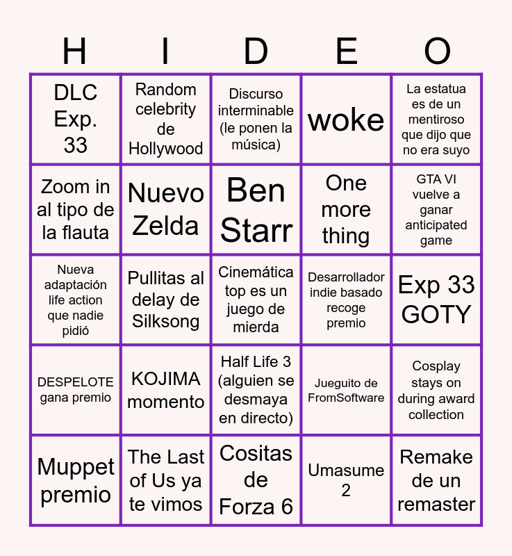 This bingo card has a free space and 24 words: KOJIMA momento, The Last of Us ya te vimos, Ben Starr, Muppet premio, La estatua es de un mentiroso que dijo que no era suyo, DLC Exp. 33, Zoom in al tipo de la flauta, Random celebrity de Hollywood, Desarrollador indie basado recoge premio, Half Life 3 (alguien se desmaya en directo), One more thing, Nueva adaptación life action que nadie pidió, Jueguito de FromSoftware, Cosplay stays on during award collection, Nuevo Zelda, Umasume 2, Exp 33 GOTY, Discurso interminable (le ponen la música), GTA VI vuelve a ganar anticipated game, Pullitas al delay de Silksong, Remake de un remaster, DESPELOTE gana premio, woke and Cositas de Forza 6.