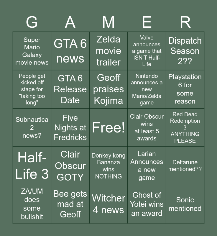 This bingo card has a free space and 24 words: Clair Obscur GOTY, Bee gets mad at Geoff, Geoff praises Kojima, ZA/UM does some bullshit, Dispatch Season 2??, Super Mario Galaxy movie news, People get kicked off stage for "taking too long", GTA 6 news, Clair Obscur wins at least 5 awards, Donkey kong Bananza wins NOTHING, Nintendo announces a new Mario/Zelda game, Subnautica 2 news?, Larian Announces a new game, Deltarune mentioned??, GTA 6 Release Date, Ghost of Yotei wins an award, Red Dead Redemption 3 ANYTHING PLEASE, Zelda movie trailer, Playstation 6 for some reason, Five Nights at Fredricks, Sonic mentioned, Half-Life 3, Valve announces a game that ISN'T Half-Life and Witcher 4 news.