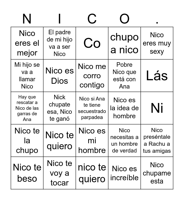 This bingo card has a free space and 24 words: Nico te quiero, Nico te voy a tocar, Nico me corro contigo, Nico te beso, Nico eres muy sexy, Nico eres el mejor, Mi hijo se va a llamar Nico, El padre de mi hijo va a ser Nico, Nico es la idea de hombre, Nico es mi hombre, Pobre Nico que está con Ana, Hay que rescatar a Nico de las garras de Ana, Nico necesitas a un hombre de verdad, Nico preséntale a Rachu a tus amigas, Nico es Dios, Nico es increíble, Ni, Co, Lás, Nick chupate esa, Nico te ganó, Nico chupame esta, Nico te la chupo, chupo a nico and nico te quiero.
